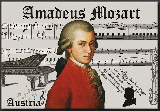 Designed with a timeless aesthetic, this magnet features a detailed portrait of the maestro set against a sophisticated backdrop. This magnet brings a touch of 18th-century Salzburg and Vienna directly into your home.